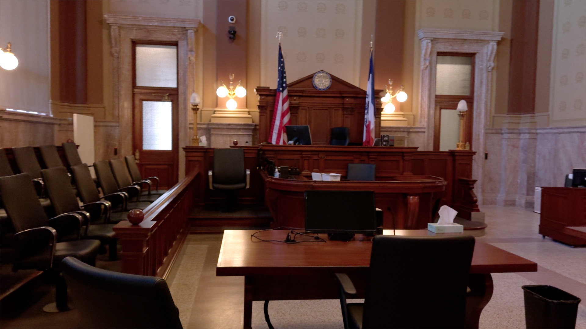 Attorney tables and spectator gallery seating